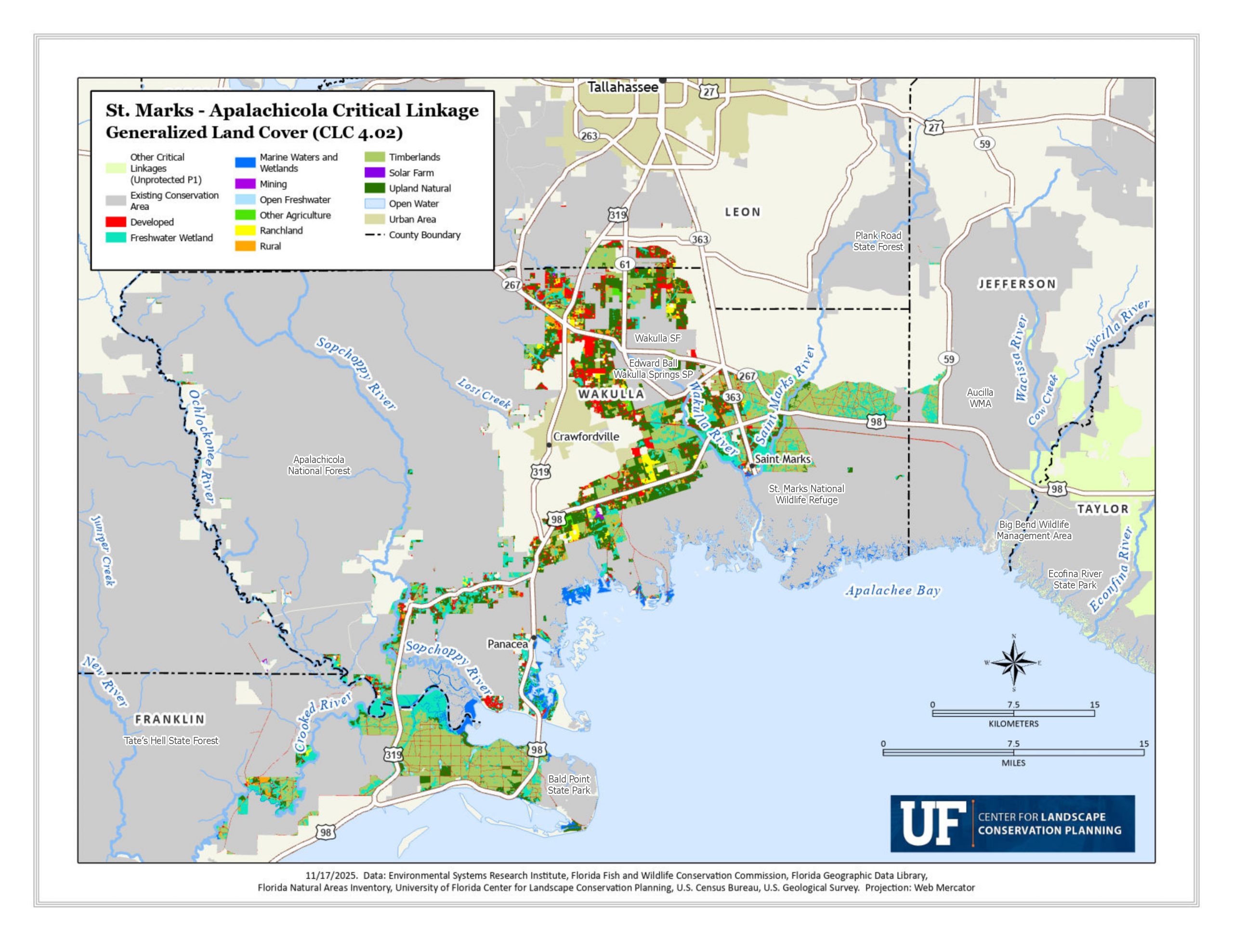 The St. Marks–Apalachicola Critical Linkage is a narrow and geographically small but vital wildlife bottleneck linking Florida’s Panhandle to the Peninsula. Protecting it ensures safe passage for black bears and potential future panther reintroduction while safeguarding key riverine systems, springs, and the surrounding natural ecosystems and timberlands. These landscapes provide critical habitat as well as aquifer recharge, water quality protection, and coastal resilience benefits. Development along the coast, sprawl from Tallahassee, and expanding road networks make this linkage highly vulnerable.