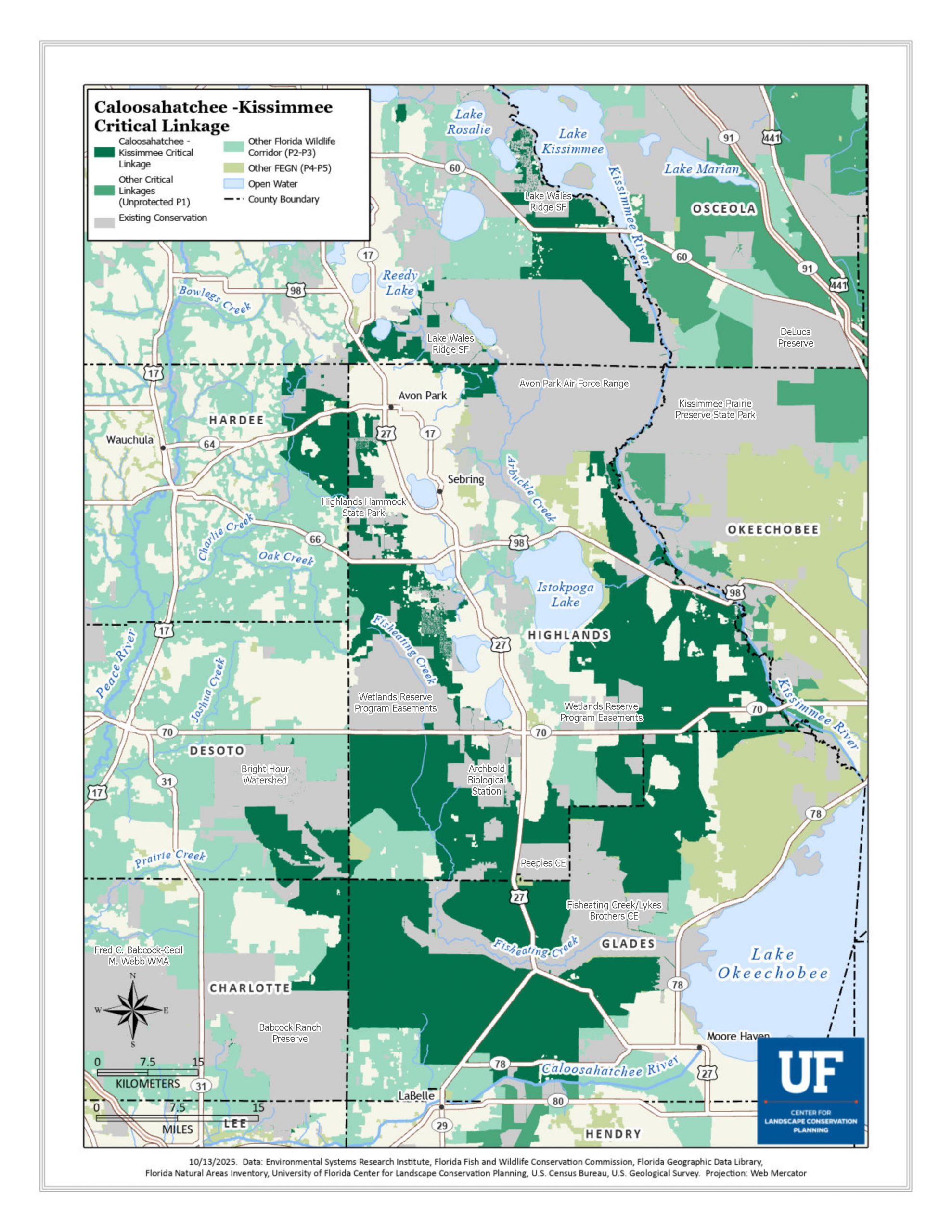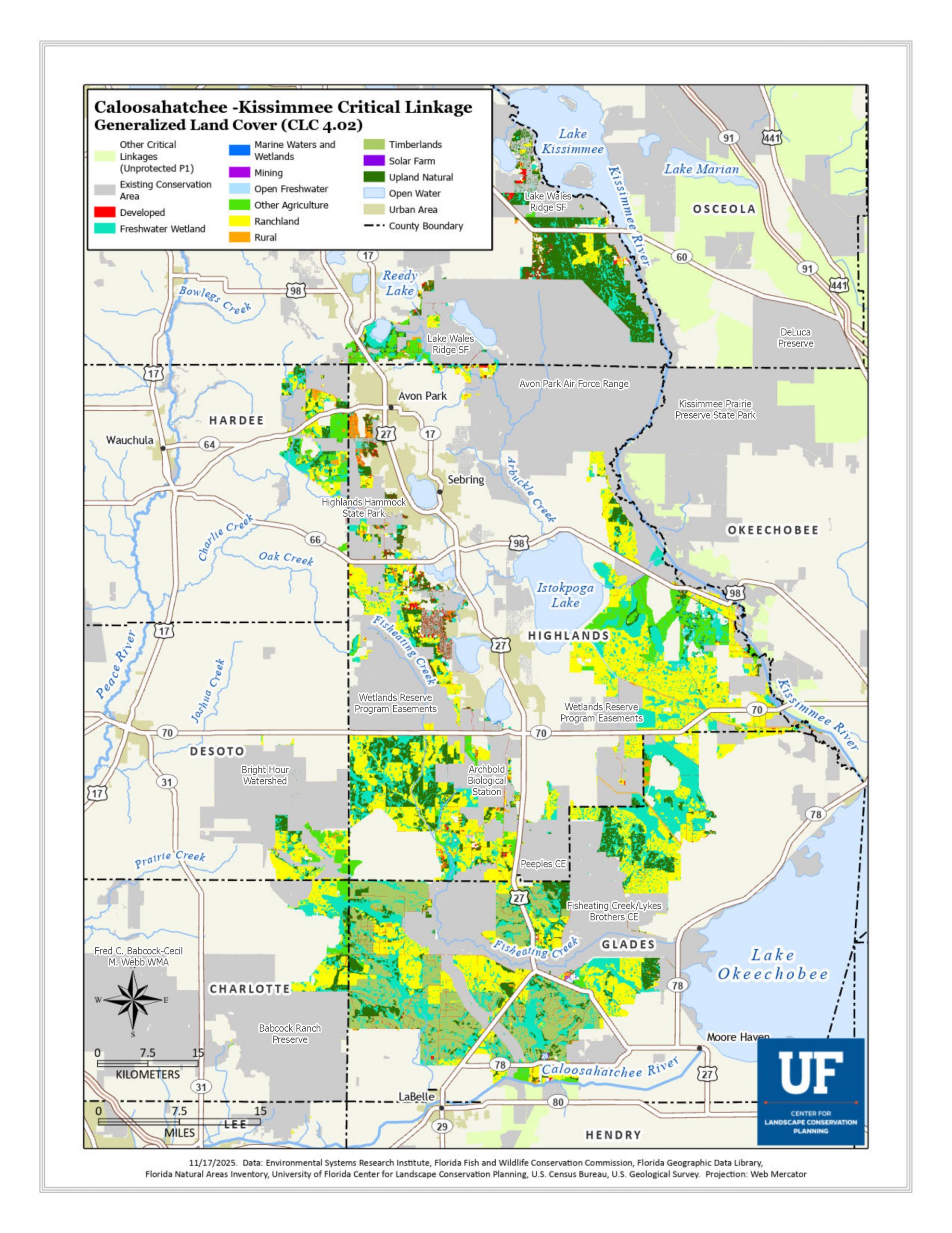 The Caloosahatchee–Kissimmee Critical Linkage is a 550,000-acre inland corridor vital for Florida panther movement north of the Caloosahatchee River and for protecting the headwaters of the Everglades. The linkage encompasses the Fisheating Creek and Kissimmee River systems—two of Florida’s most important riverine landscapes—while surrounding ranchlands and dry prairies sustain biodiversity, hydrology, and rural economies. Other significant natural communities within the linkage include mesic flatwoods and scrub, particularly where it overlaps with the Lake Wales Ridge. Coordinated conservation across this landscape is essential to maintaining ecological and agricultural resilience in the heart of the peninsula.