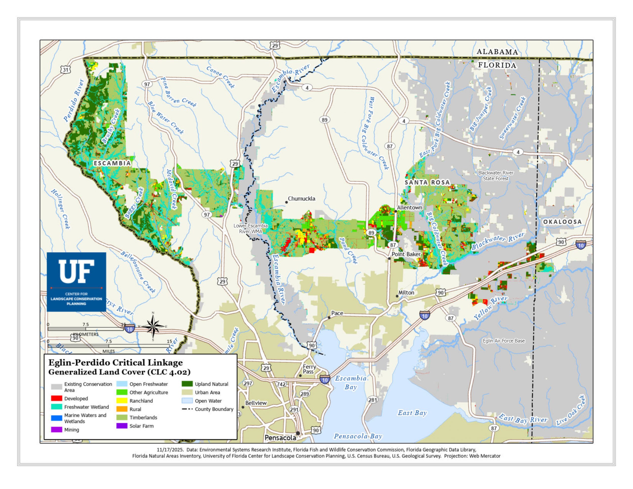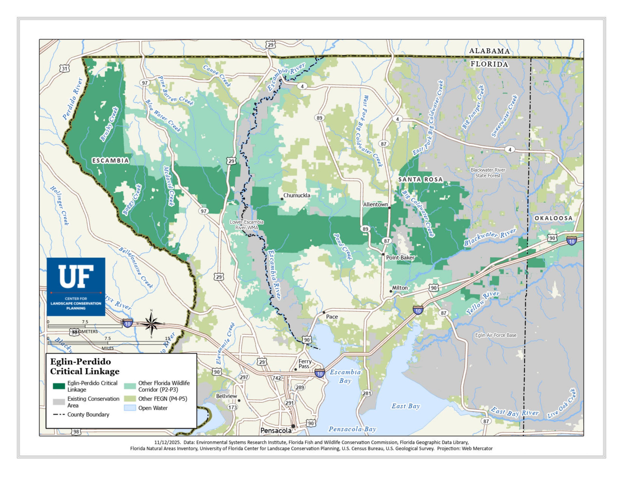 The Eglin–Perdido Critical Linkage is Florida’s westernmost corridor, connecting to Alabama and supporting some of the most biologically diverse and globally rare habitats in the state. The landscape includes a significantly large tract of upland pine habitat along the Perdido River, along with pitcher plant bogs, bottomland forests, blackwater streams, and other rare natural communities. Its timberlands provide wildlife habitat, carbon storage, and opportunities for long-term ecological restoration—particularly of historic longleaf pine ecosystems. While the region faces growing development pressure, its protection is essential to maintaining ecological resilience and wildlife connectivity across the northern Gulf Coast.