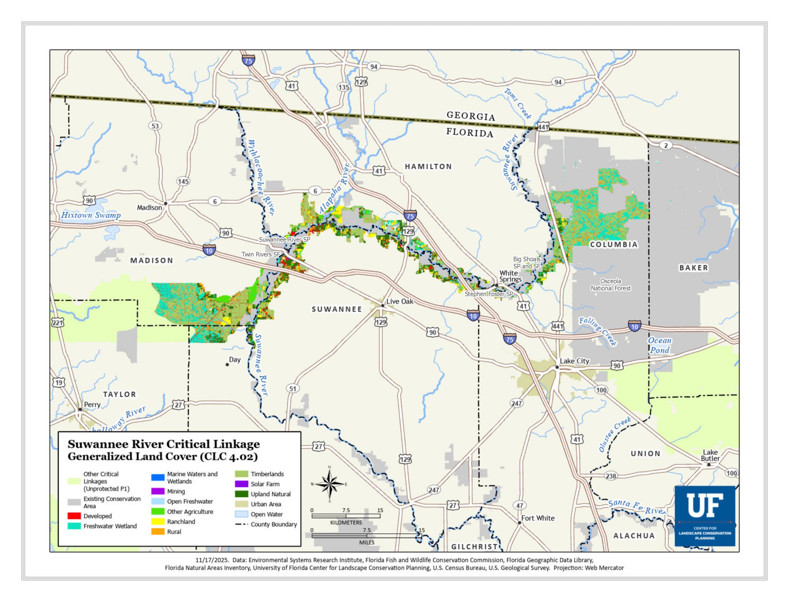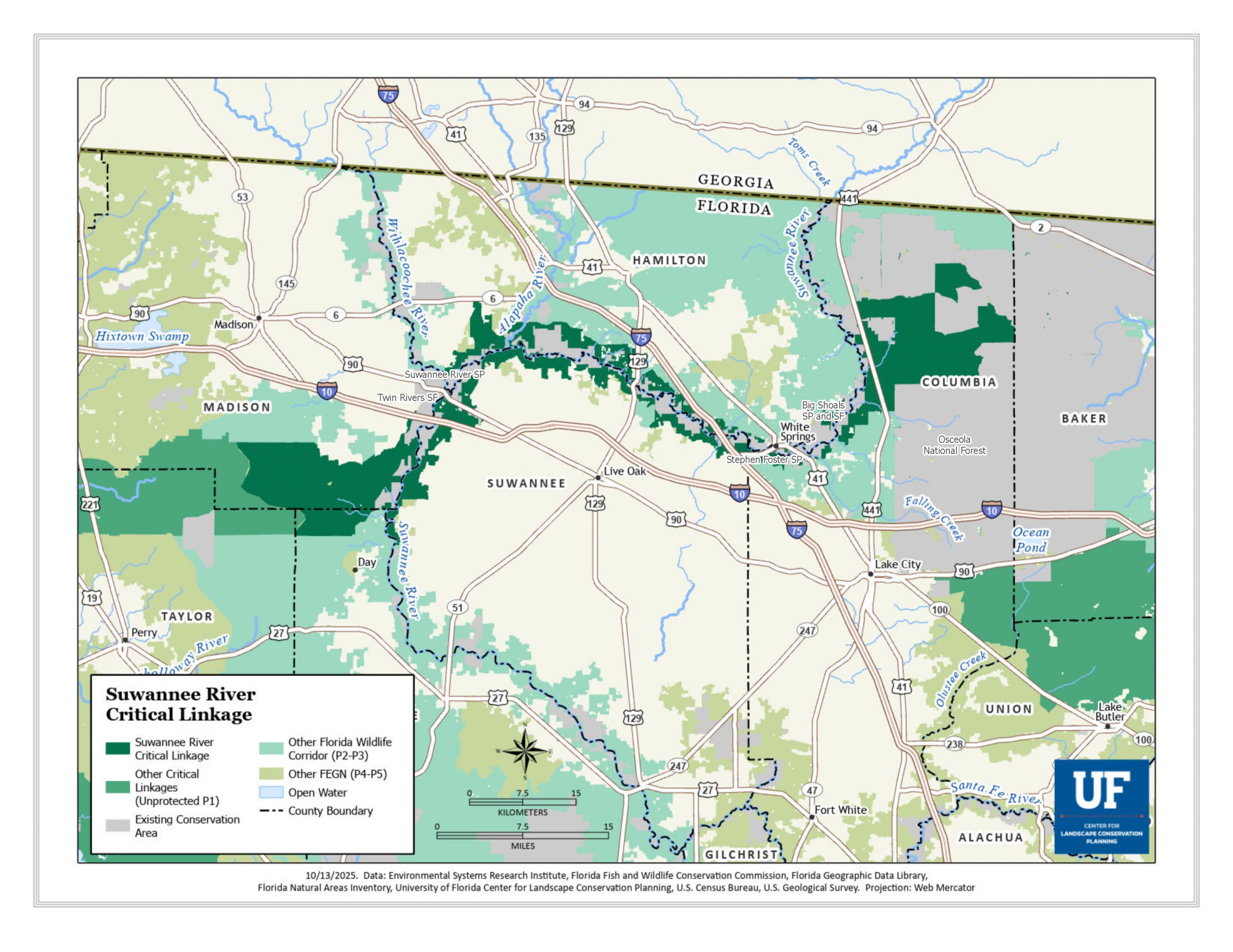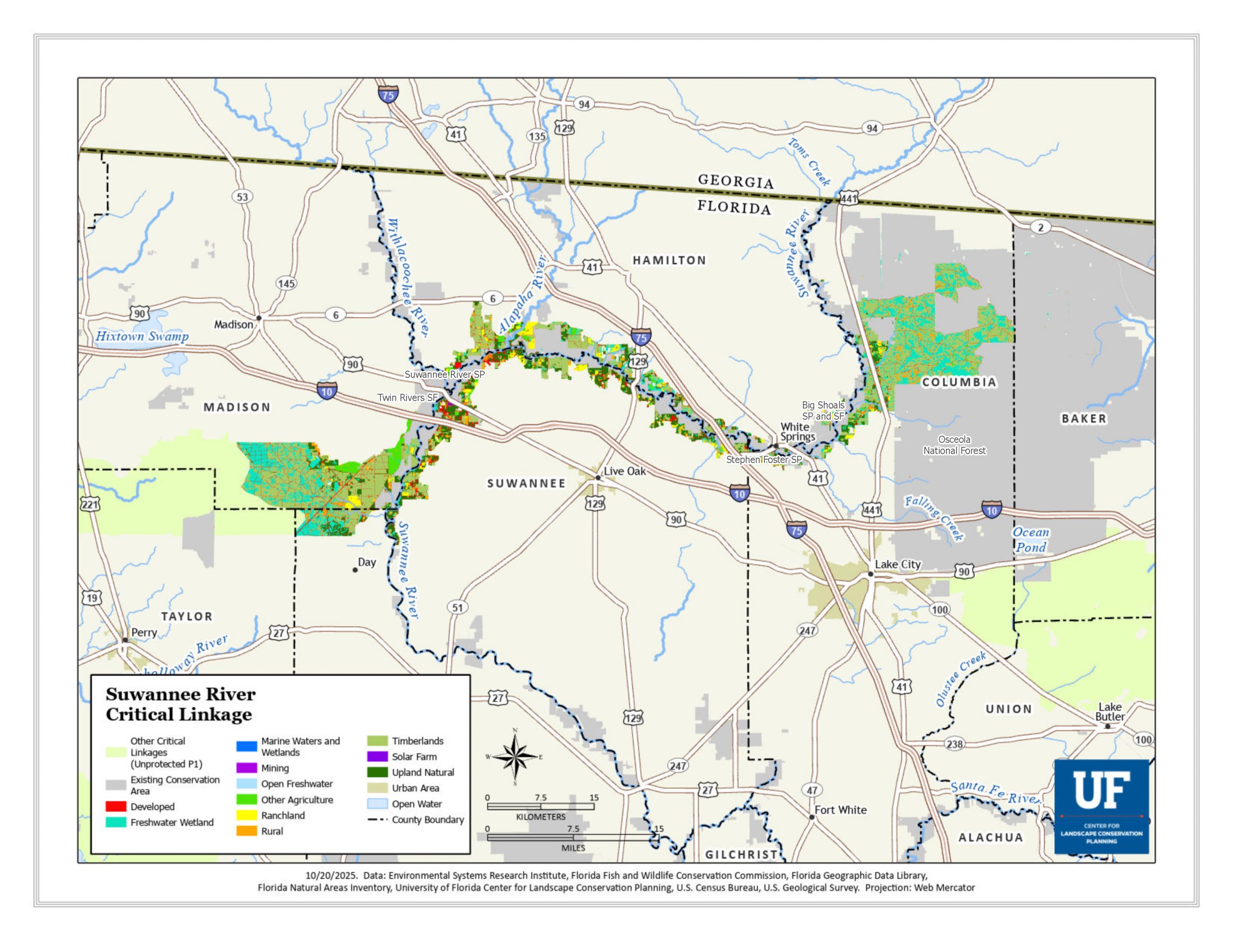 The Suwannee River Critical Linkage connects Osceola National Forest to Florida’s Panhandle while safeguarding one of the state’s most iconic river systems. Multiple springs, rich natural history, and cultural heritage define this North Florida landscape. Conservation within this linkage supports wildlife passage, aquifer recharge, clean water, recreation, and rural livelihoods. Because much of the corridor consists of small parcels and active agricultural lands, protecting it requires innovative partnerships with local landowners and community-driven conservation solutions.